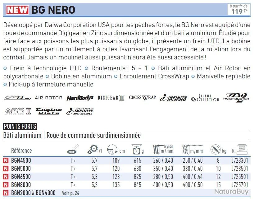 Développé par Daiwa Corporation USA pour les pêches fortes, le moulinet BG Nero est équipé d’une roue de commande Digigear en Zinc surdimensionnée et d’un bâti aluminium.